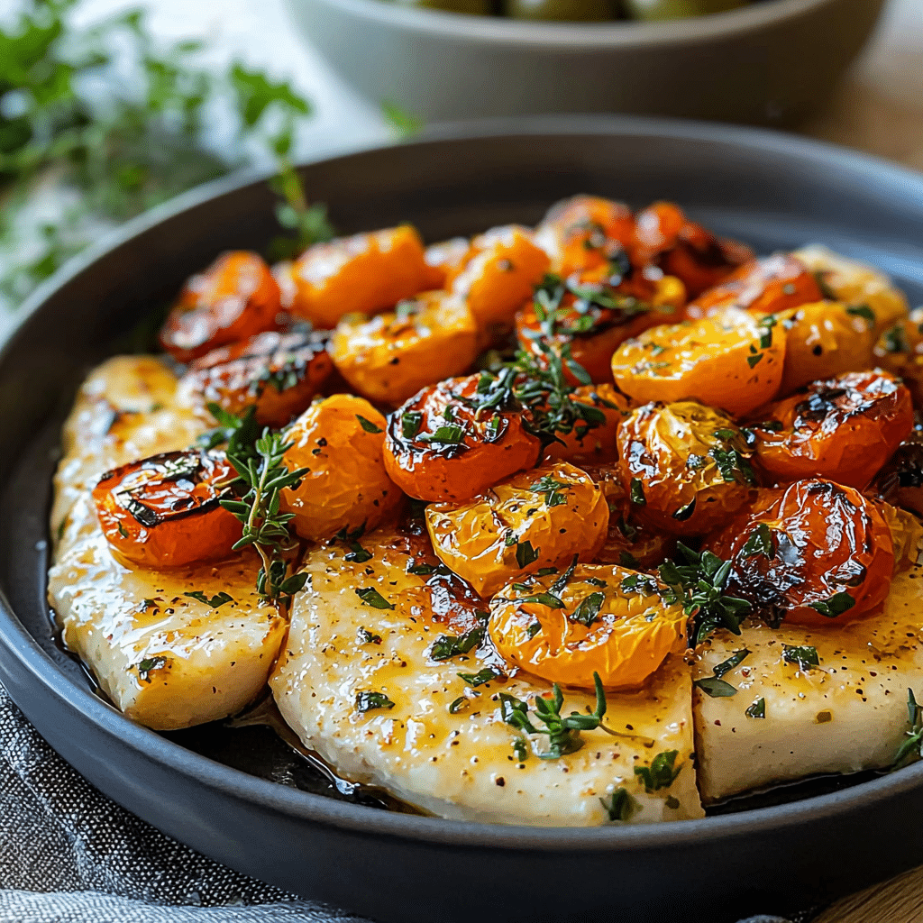 This Baked Halloumi with Roasted Cherry Tomatoes and Thyme is a Mediterranean-inspired vegetarian dish that celebrates simplicity and flavor. Salty, golden halloumi cheese is roasted alongside juicy cherry tomatoes, olive oil, and fresh thyme, creating a warm, savory meal or appetizer with minimal ingredients and effort.