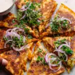 A flavorful chicken quesadilla filled with tender seasoned chicken, sweet caramelised onions, melted cheese, and fresh herbs—crispy on the outside and deliciously melty on the inside.
