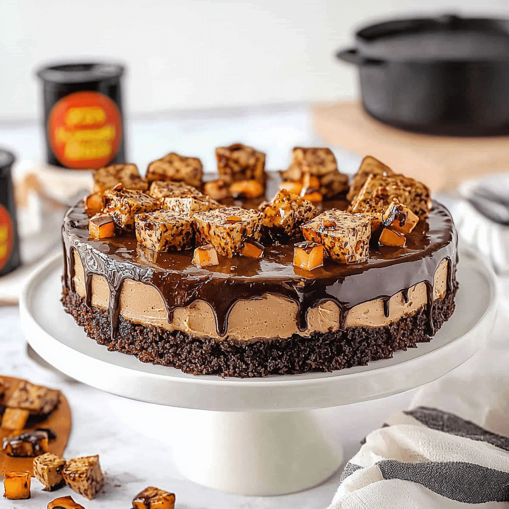 This Chocolate Caramel Candy Bar Cheesecake is a rich, no-bake cheesecake featuring a crunchy chocolate crust, a creamy caramel filling, and a topping of chopped candy bars and chocolate ganache.
