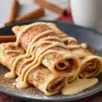 Thin, soft crepes filled with a buttery cinnamon-sugar swirl and drizzled with sweet cream cheese icing for a cinnamon roll–inspired breakfast treat.