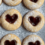 Buttery, tender shortbread-style cookies cut into heart shapes and filled with sweet fruit jam, perfect for holidays or gifting.