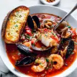 This rich and flavorful seafood stew combines shrimp, mussels, clams, and white fish in a garlicky tomato broth. Served with crusty garlic bread, it’s perfect for cozy dinners or special occasions.