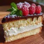 Raspberry Cream Cake Slice is a light, elegant dessert featuring fluffy vanilla sponge layers filled with a cloud-like cream filling. The cake is topped with a glossy chocolate ganache and crowned with fresh raspberries and a dusting of powdered sugar. Every bite offers a perfect balance of rich chocolate, delicate cream, and bright berry freshness.
