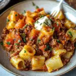 This hearty rigatoni with meat sauce features tender pasta coated in a rich, savory tomato and ground beef sauce. It is a comforting, filling dish perfect for weeknights or casual gatherings.