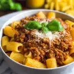 Rigatoni with Slow-Cooked Meat Sauce is a hearty Italian pasta dish featuring tender rigatoni noodles smothered in a rich, flavorful sauce made with ground meats, tomatoes, and aromatic herbs, slowly simmered to perfection.