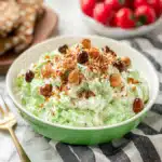A classic vintage dessert salad made with lime gelatin, crushed pineapple, cream cheese, whipped topping, and chopped pistachios, creating a creamy and fruity treat perfect for holidays or potlucks.