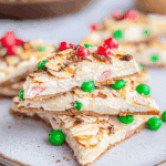 White Chocolate Christmas Bark is a festive, no-bake holiday treat made with creamy white chocolate, crunchy almonds, crushed peppermint, and colorful holiday candies. Perfect for gifting, party trays, or snacking during the holiday season.