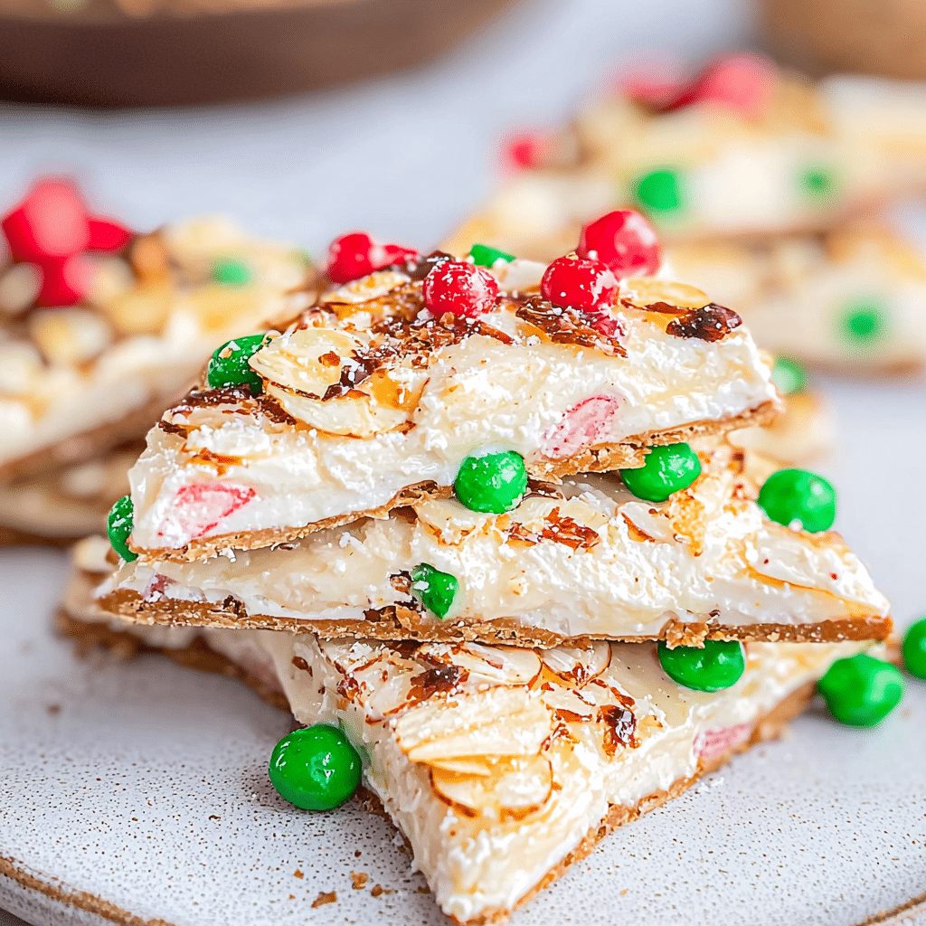 A festive white‑chocolate bark studded with roasted almonds, crushed peppermint and colorful holiday candies—crisp, break‑apart, and perfectly seasonal.